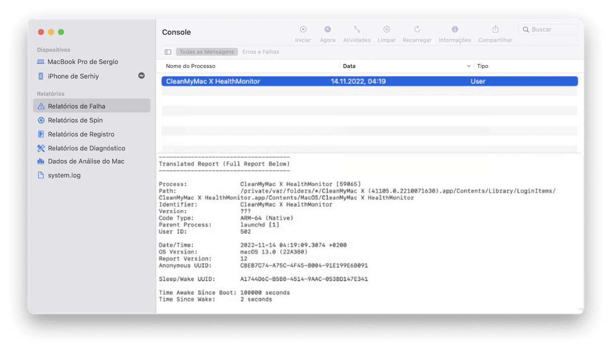 Você também pode encontrar todos os relatórios no Console. Acesse Finder > Aplicativos > Utilitários > Console. Depois de abrir o Console, clique em “Relatórios de Falha” na barra lateral.