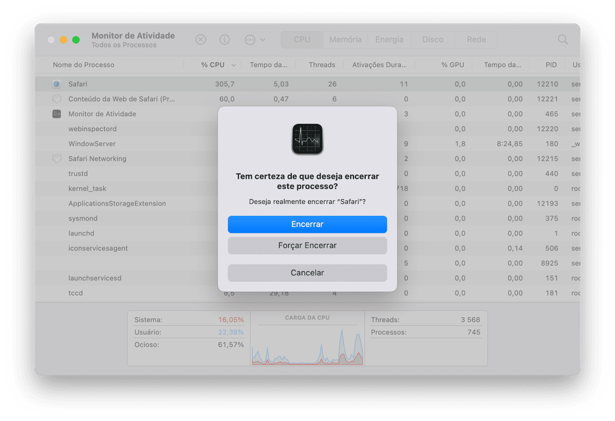 - Use o Monitor de Atividade para encerrar qualquer app que use muitos recursos, como memória e CPU. Basta selecionar um item e clicar no X na barra de ferramentas.