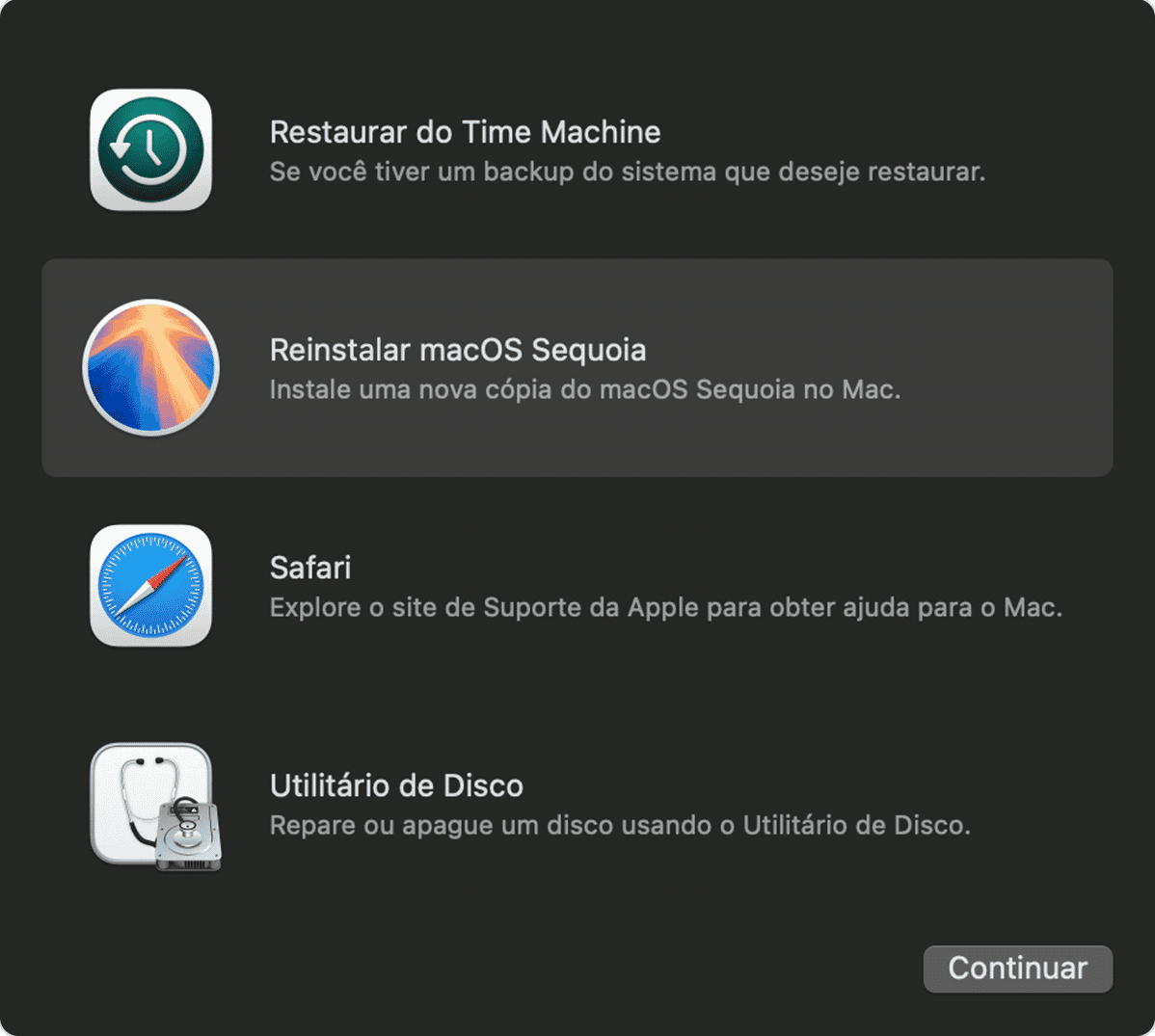 - Acesse Utilitários do macOS > Reinstalar o macOS > Continuar. Instale os aplicativos que serão necessários.