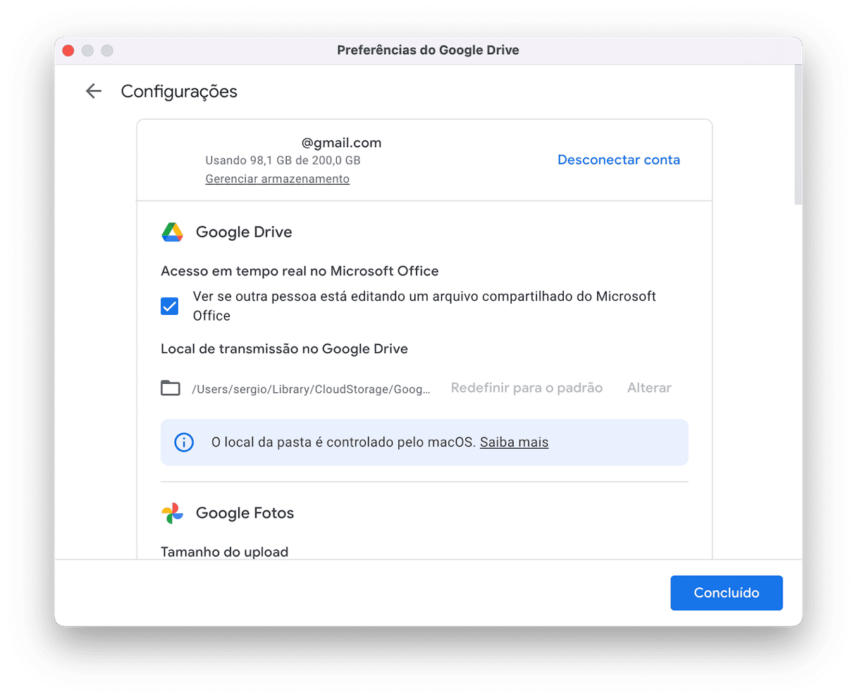 Pronto! Você desconectou a sua conta do app Drive para computador, o que significa que a pasta do Google Drive não está mais sendo sincronizada.