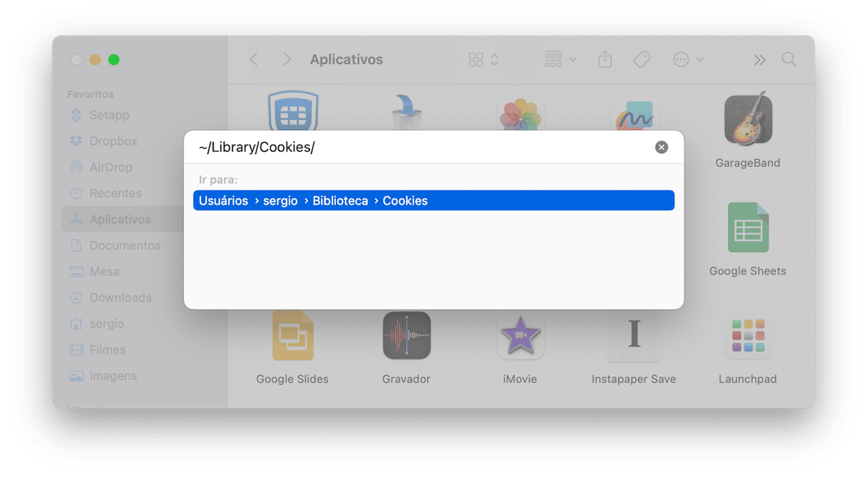 ~/Biblioteca/Cookies/~/Biblioteca/Preferences/~/Biblioteca/Containers/~/Biblioteca/Group Containers/~/Biblioteca/Application Scripts/ - Pressione Return depois de colar cada caminho.