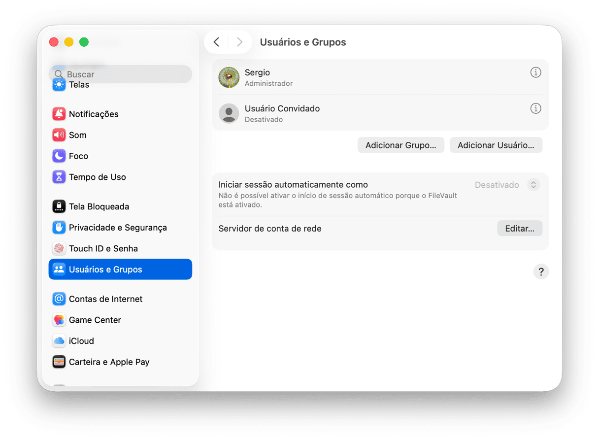 - Verifique os usuários em Ajustes do Sistema > Usuários e Grupos. Clique no “i” ao lado do usuário com a sessão iniciada e verifique se a opção “Permitir que este usuário administre o computador” está selecionada. Se você não tiver permissões de administrador, será necessário adicionar ou acessar uma conta que tenha.