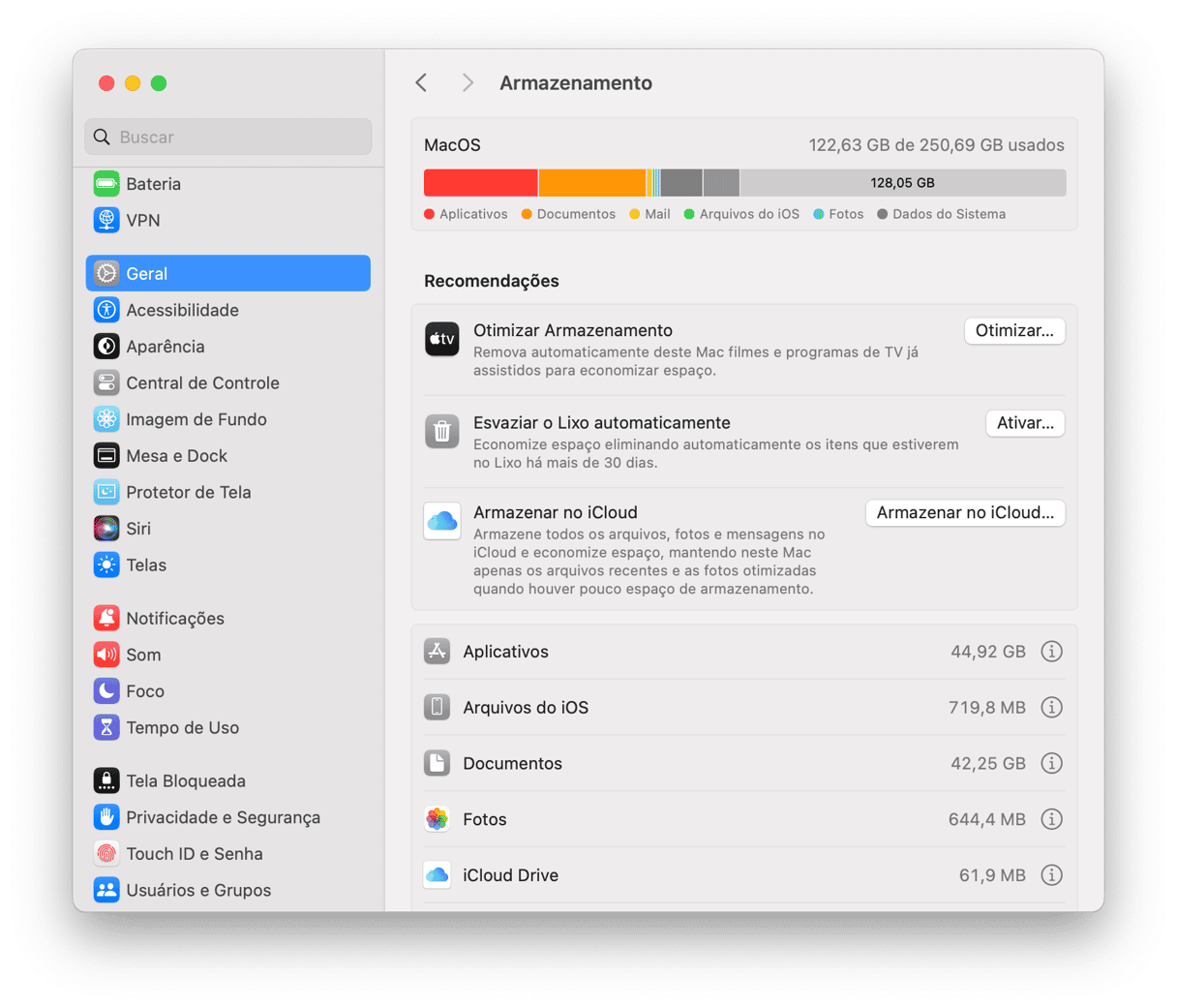 - Acesse o menu Apple > Ajustes do Sistema > Geral > Armazenamento.