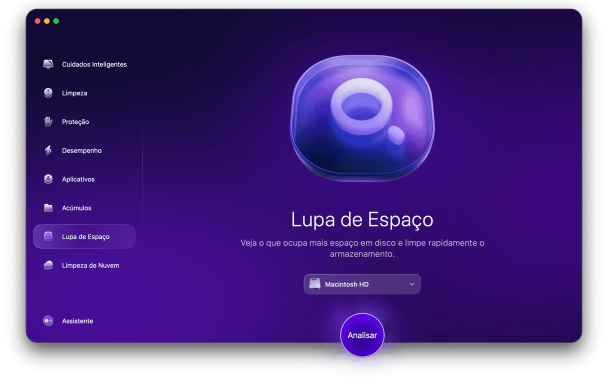 - Abra o app e clique em Lupa de Espaço > Analisar. Embora você possa escolher qualquer local para analisar, recomendamos começar pela sua pasta pessoal (a pasta com o seu nome). Você também pode escolher o disco inteiro (Macintosh HD).