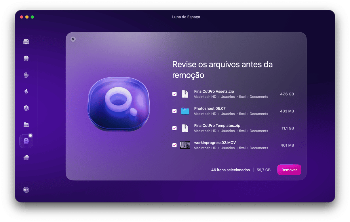 A forma mais rápida e segura de ver e remover os arquivos ocultos é usando um app de limpeza como o CleanMyMac. Uma de suas ferramentas (chamada Lupa de Espaço) constrói um mapa interativo do armazenamento do computador, para que você apague qualquer coisa que não precise mais. Você também pode usar a mesma ferramenta caso queira apenas ver o que fica escondido.