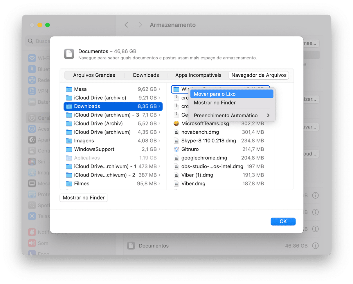 O macOS oferece uma ferramenta fácil de usar chamada Armazenamento Otimizado. Ela mostra recomendações para liberar espaço no Mac. Para acessá‑la, clique no menu Apple > Sobre Este Mac > Mais Informações > Ajustes de Armazenamento ou acesse Ajustes do Sistema > Geral > Armazenamento. Abaixo da barra de Armazenamento, você verá algumas recomendações, como “Armazenar no iCloud”, Otimizar Armazenamento e “Esvaziar o Lixo Automaticamente”.