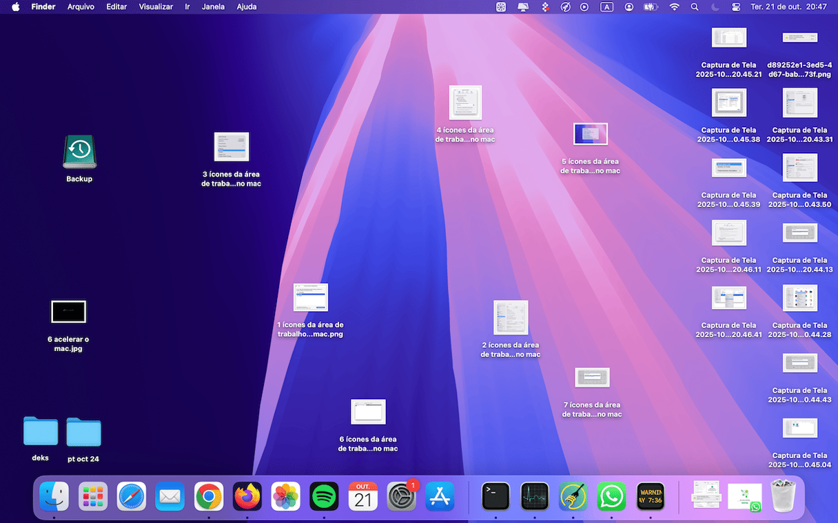 Mas por que limpar a mesa, você pergunta. Porque é difícil enxergar a mesa de certas pessoas. Organize a mesa e livre-se das coisas que não precisam estar lá. O visual é melhor e isso ajuda a deixar o Mac mais rápido (não sei a ciência por trás dessa afirmação, mas é bom demais para ser mentira). Seu Mac não precisa perder tempo carregando todos aqueles ícones. Apenas limpe, vai… É melhor assim.