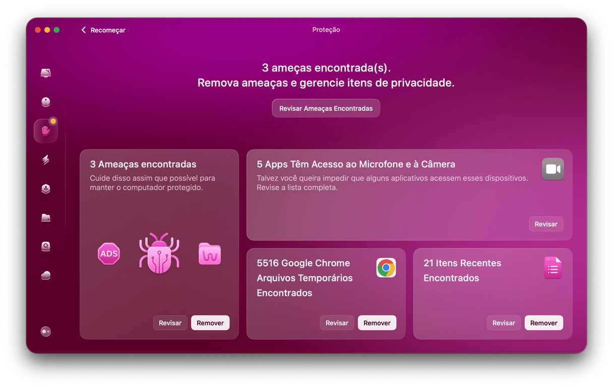 A única forma de saber com certeza se alguma ferramenta maliciosa foi instalada por supostos invasores é com uma ferramenta especializada na busca de malware. Recomendamos que você use a ferramenta Remoção de Malware do CleanMyMac (encontre‑a dentro do recurso Proteção).