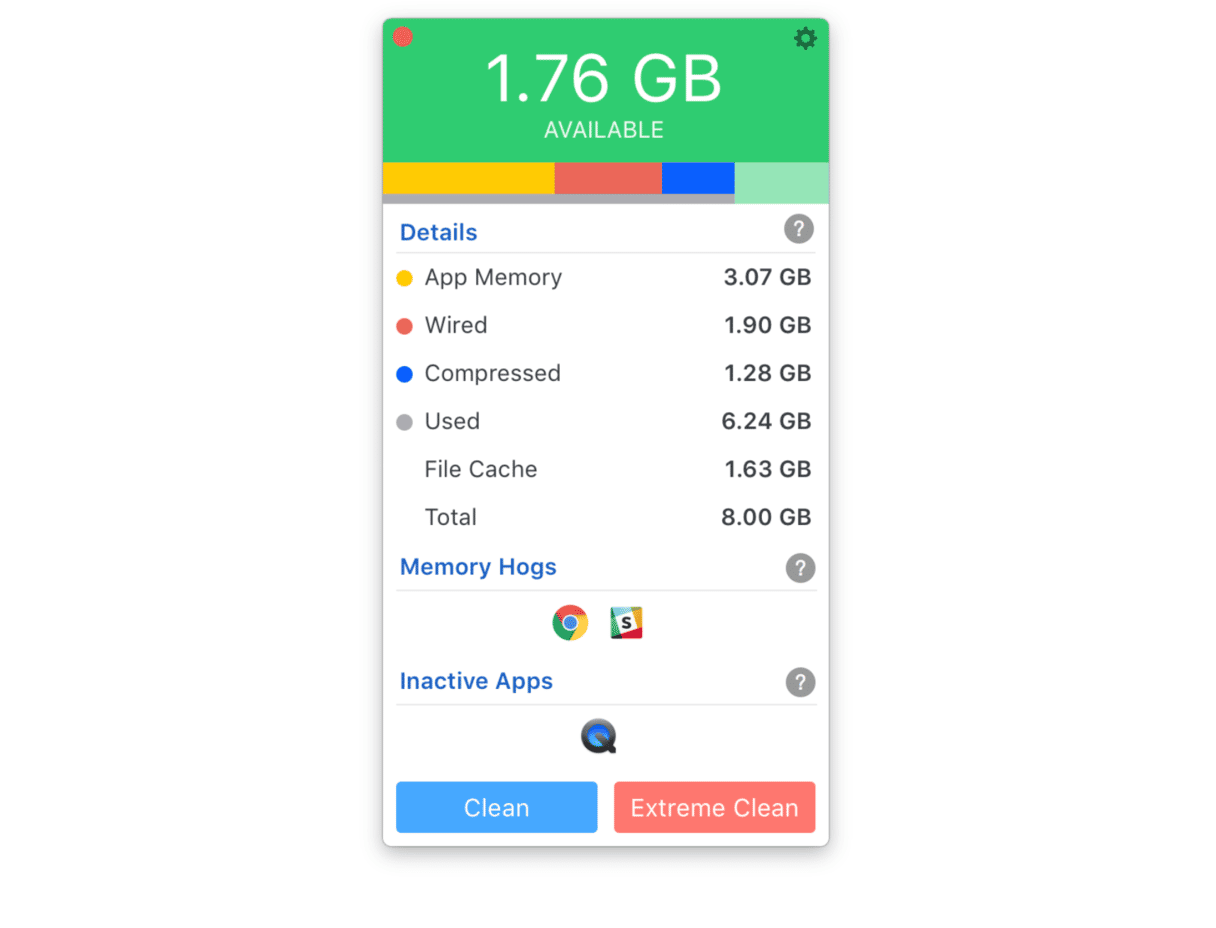 Memory Clean is a menu bar item that shows how much memory you have available and what is occupying the rest. It also displays the apps that are eating out your Mac’s resources and inactive apps occupying RAM. There are two options for cleaning, Clean and Extreme Clean, and you can also set Memory Clean to free up RAM automatically, so you never have to think about it.