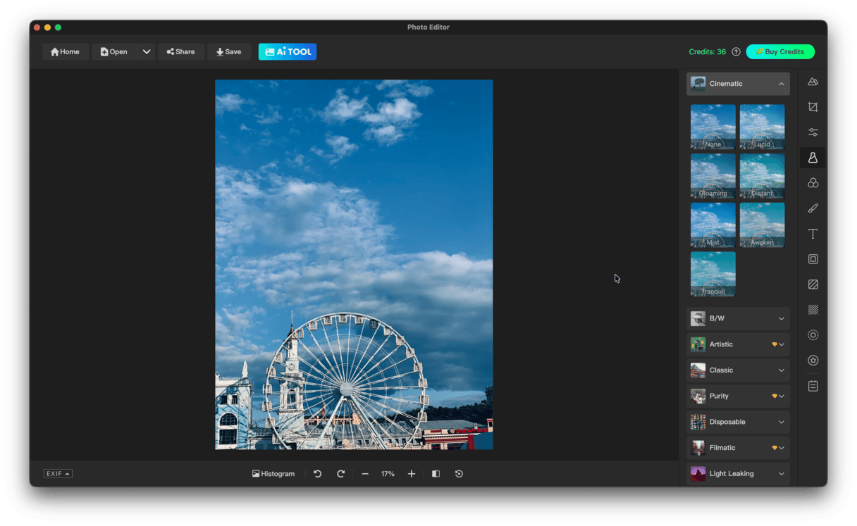 While there’s no point in comparing Fotor to Adobe Photoshop this lightweight photo editor for Mac does have some interesting features. It excels at one-click fixes and filters, and is perfect for busy photographers looking for a quick edit. Fotor’s focus is less on fixing mistakes and making corrections to lighting and tone, and more on creating stylized images that can be shared on social media. There’s definitely a place for this type of editing in your tool kit, and it may work great in conjunction with other image editors on this list.