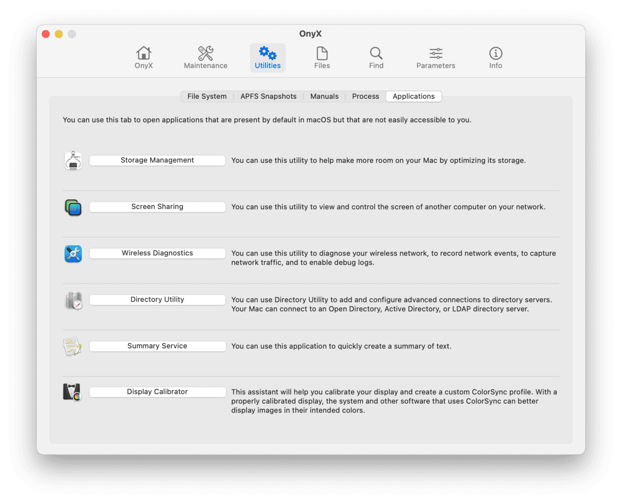 - Utilities: These are the most technical operations the application can perform. I’ll confess that I’m not exactly sure what many of the tabs in this section are for, but I did find the Applications tool very useful. This feature collects a number of useful but usually hidden features on your Mac in one place, including Storage Management, Screen Sharing, and Wireless Diagnostics apps. Although these are usually buried deep in System Settings, it’s nice to have them on hand.