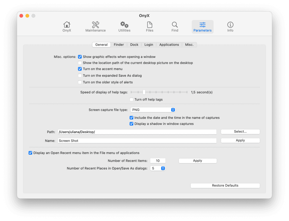- Parameters: This section offers dozens of options for changing the way your Mac operates. From general choices about display speeds and graphic effects to customization options for the Finder and the Dock, it lets you fine-tune all the parts of your computer that you thought were stuck that way for good. As a bonus, if you’ve somehow lost control over new parameters, there’s an option of restoring defaults that comes in handy.