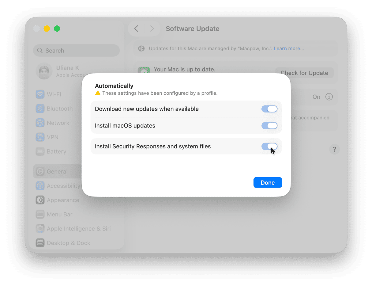 - In System Settings > General > Software Updates, click the i next to macOS updates and Security Responses.