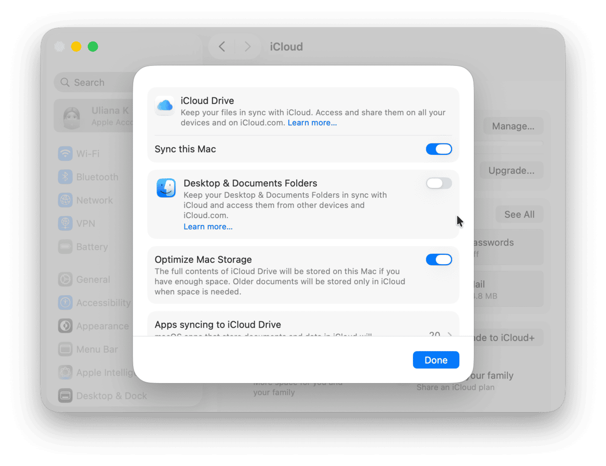 If you click See All, you will see what is synced with iCloud. If you turn off some apps in this pane, they will stop syncing with iCloud. iCloud Drive and Photos are prime suspects worth a closer look. Are there too many large documents on your Mac? If so, iCloud will hog up resources trying to sync all that massive data. To ensure that it does not waste valuable system resources, choose only those apps and types of documents you need synced and disable the rest of them. We recommend syncing only essential files.