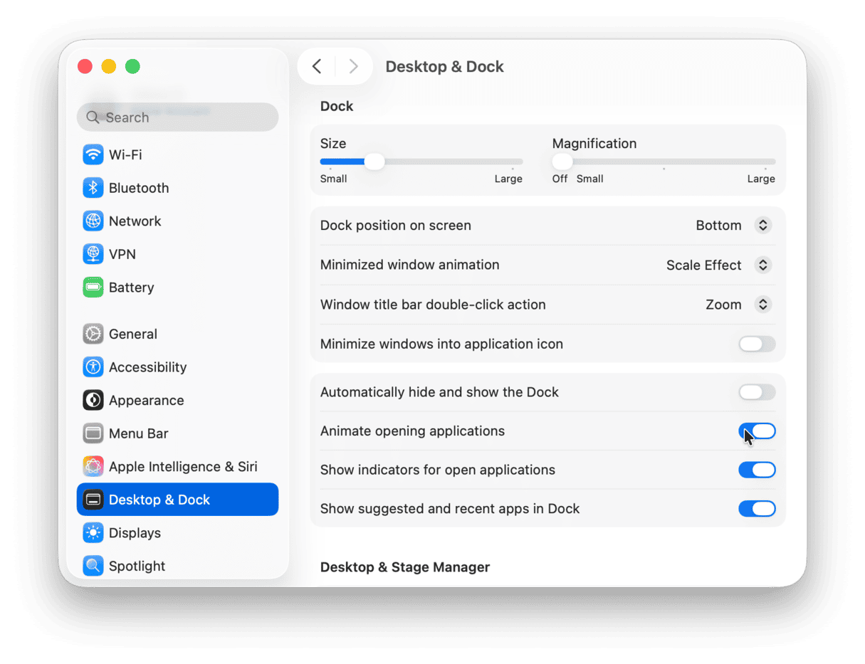 - Disable the following options: “Animate opening applications,” “Automatically hide and show the Dock.”
