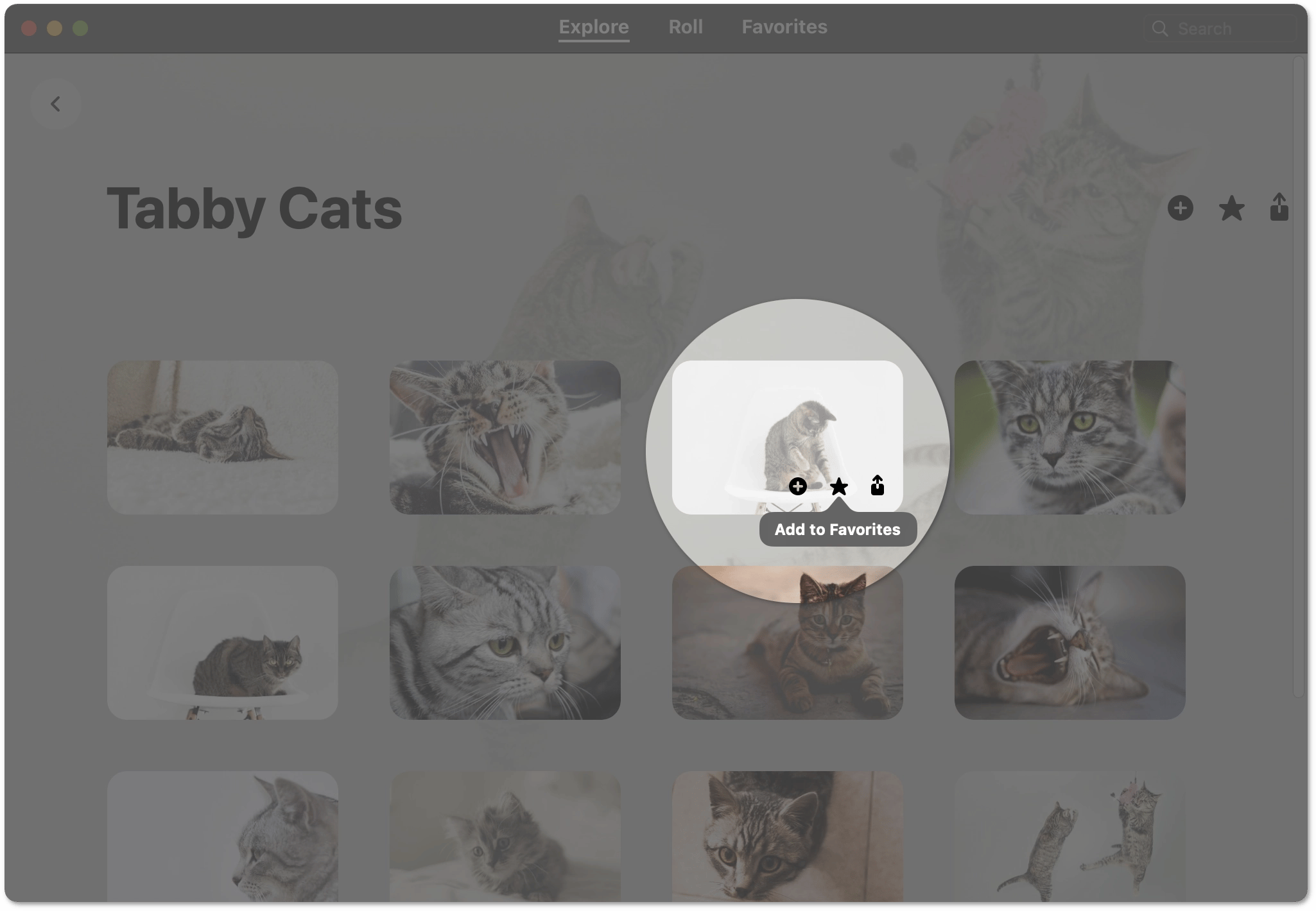 Open a collection, hover over a picture thumbnail and click Add to Favorites (