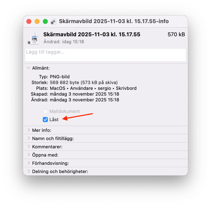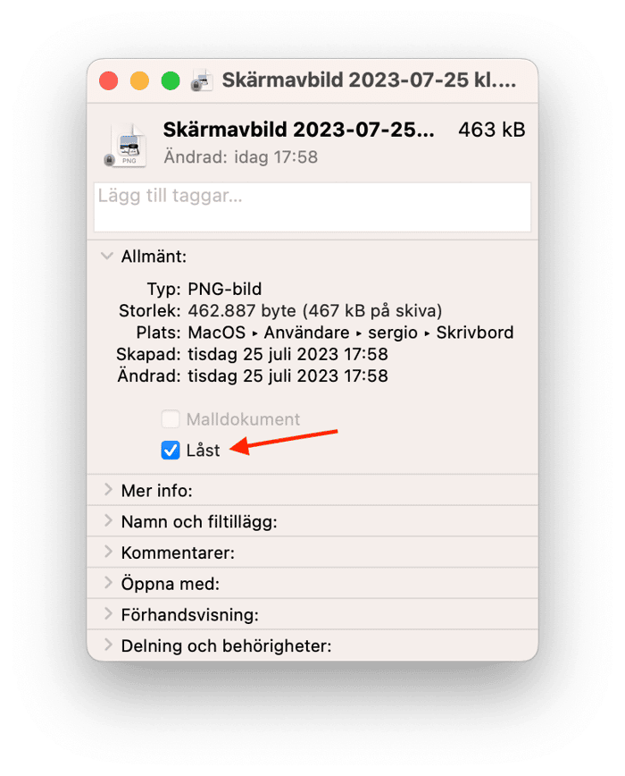 Alternativet att låsa filer på Mac finns under Visa info-menyn om du håller ner Control + klickar på en fil.