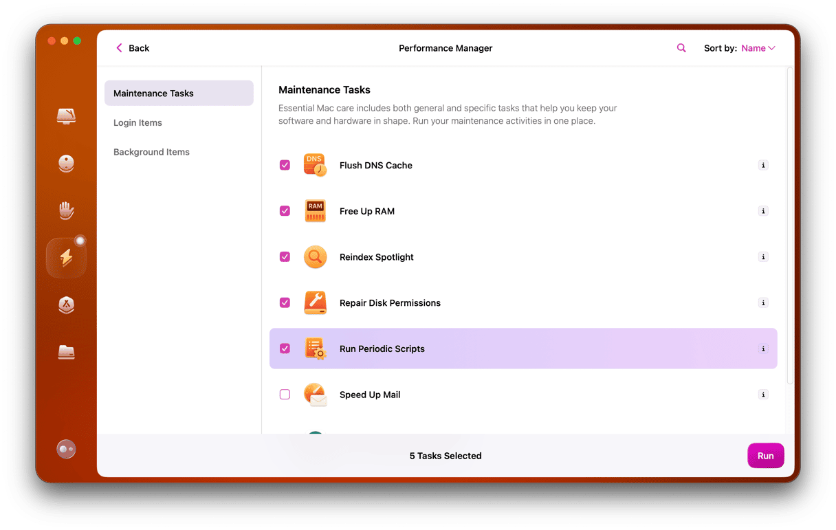 CleanMyMacs modul Performance gör det mycket enklare att utföra regelbundna underhållsrutiner på Mac. Den rekommenderar ett antal underhållsåtgärder för att hålla datorn i form och allt du behöver göra är att klicka på ”Run”. CleanMyMac utför uppgifter som att bygga om Spotlight-indexet, reparera skivbehörigheter eller snabba upp Mail. Få en kostnadsfri provperiod av CleanMyMac. När du har hämtat och installerat följer du stegen nedan: