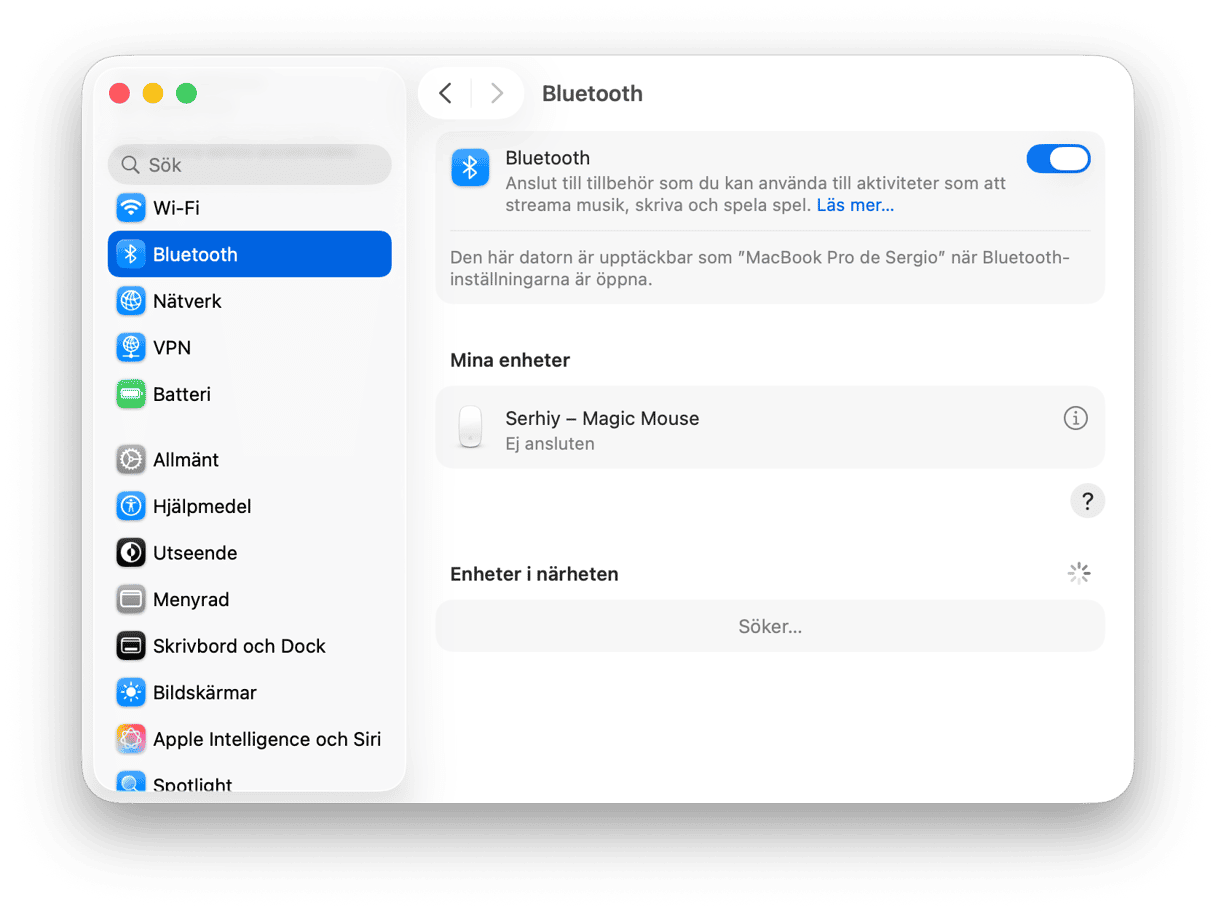 Precis som med wifi är det första steget att stänga av bluetooth och sedan slå på det igen i Kontrollcenter. Om det inte fungerar startar du om datorn.