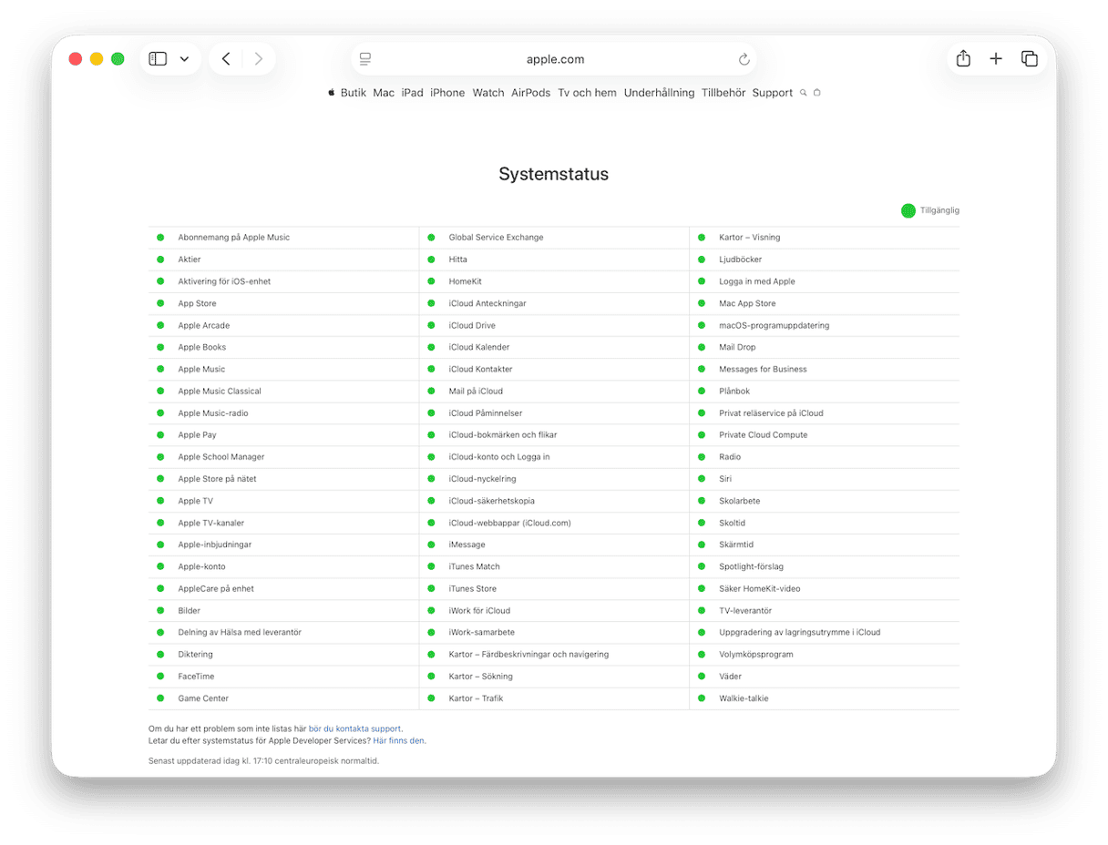 - Kontrollera att Apples servrar fungerar som de ska. Gå till Apples sida med systemstatus och kontrollera att det finns en grön prick bredvid ”macOS-programuppdatering”.