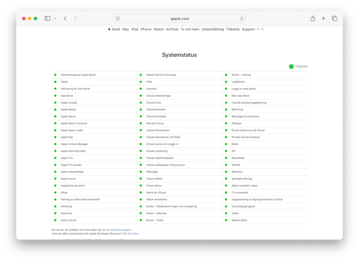 Apple har en statussida på sin webbplats med alla deras onlinetjänster som visar om de är aktiva med gröna eller röda signaler. Du hittar den här.