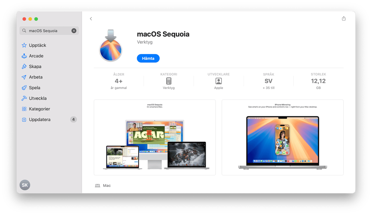 För att hitta rätt macOS-version skriver du namnet på versionen i sökfältet och klickar på ”Hämta”. Nu laddas installationsprogrammet ner. Dubbelklicka på den för att installera uppdateringen.