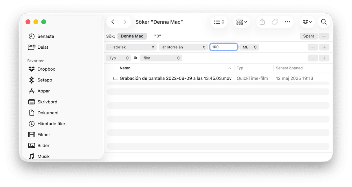 Jag använde Finders inbyggda sökfilter för att hitta stora mediefiler. Så här gjorde jag: