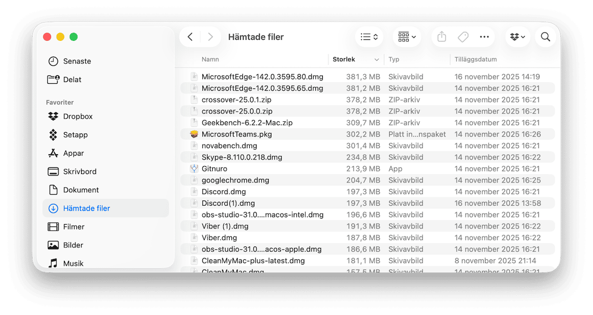 Mappen Hämtade filer är ett lite bortglömt utrymme som jag inte hade rört på flera månader, och den var full av gamla DMG-installationsprogram, PDF-filer och diverse ZIP-filer – allt som allt var det över 8 GB som bara låg där.