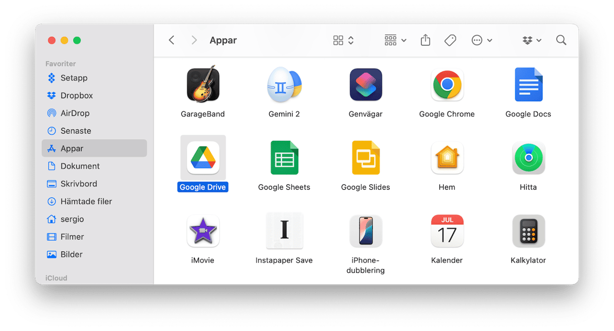 - Gå till mappen Appar och leta reda på Google Drive-appen.