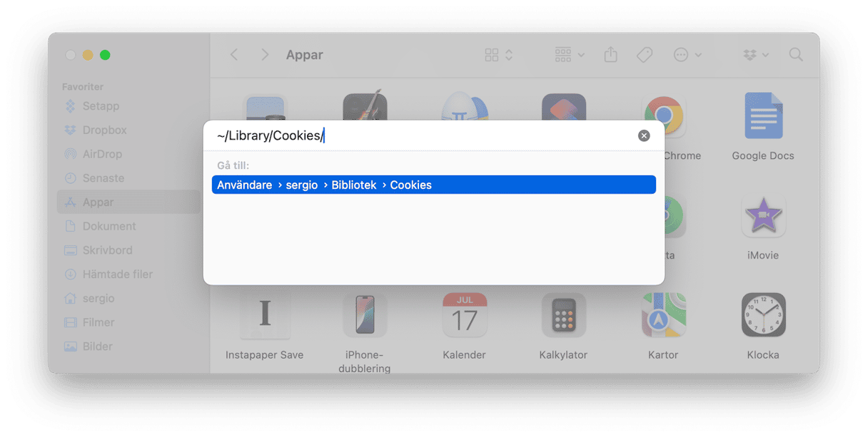 ~/Library/Cookies/~/Library/Preferences/~/Library/Containers/~/Library/Group Containers/~/Library/Application Scripts/ - Tryck på returtangenten efter varje.