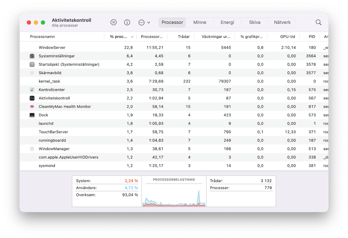 Vissa appar kräver mer kraft än andra, och kan få datorn att krypa fram. Se vilka appar som kräver systemresurserna med Aktivitetskontroll. Du kan öppna den från mappen Verktygsprogram i programmappen, eller hitta den med Spotlight.
