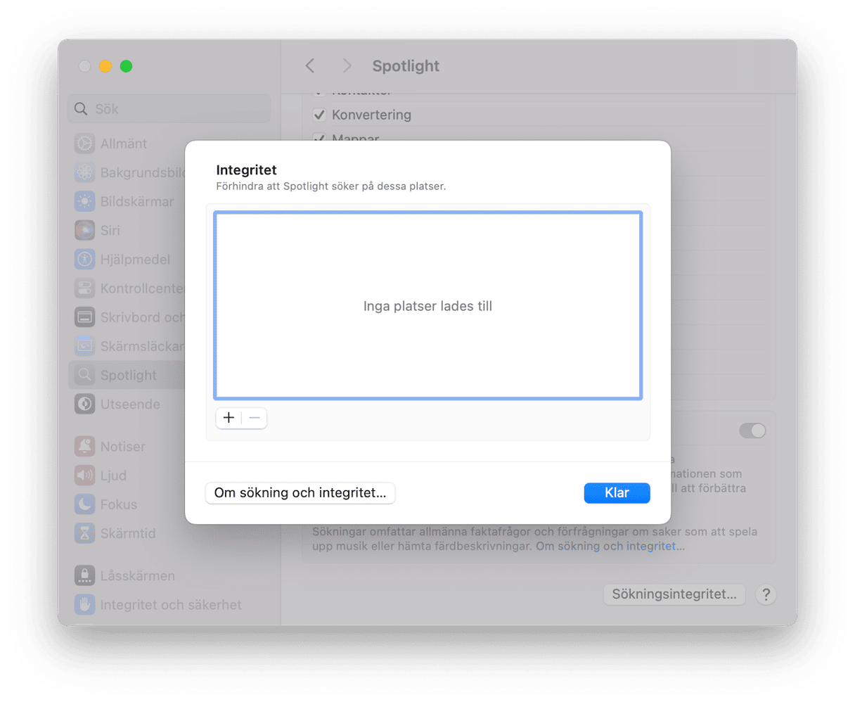 Dra nu skivan från Finder till integritetslistan. När du lagt till den tar du bort den genom att trycka på ”-”. Indexeringen börjar om, men förhoppningsvis avslutas den korrekt om några timmar och ger datorn lite extra fart.