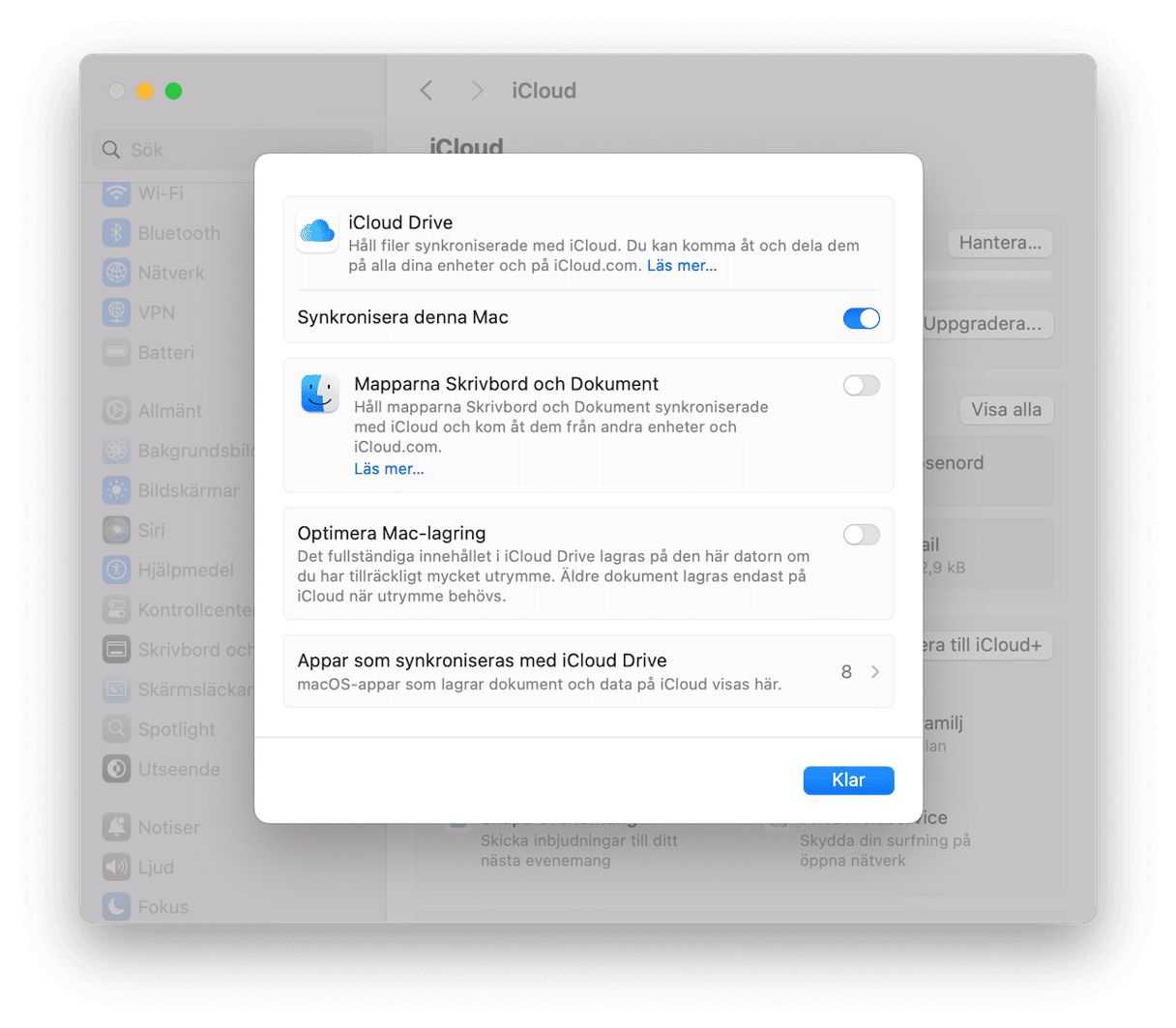 Om du klickar på Visa fler appar ser du vad som är synkroniserat med iCloud. Om du stänger av några appar i det här fönstret slutar de att synkronisera med iCloud. Det är bra att ta en närmare titt särskilt på iCloud Drive och Bilder. Finns det för många stora dokument i datorn? Om så är fallet kommer iCloud att kräva mycket resurser vid synkroniseringen av alla dessa data. För att se till att värdefulla systemresurser inte slösas bort bör du bara välja de appar och typer av dokument som du vill synkronisera och inaktivera resten av dem. Vi rekommenderar att du bara synkroniserar viktiga filer.