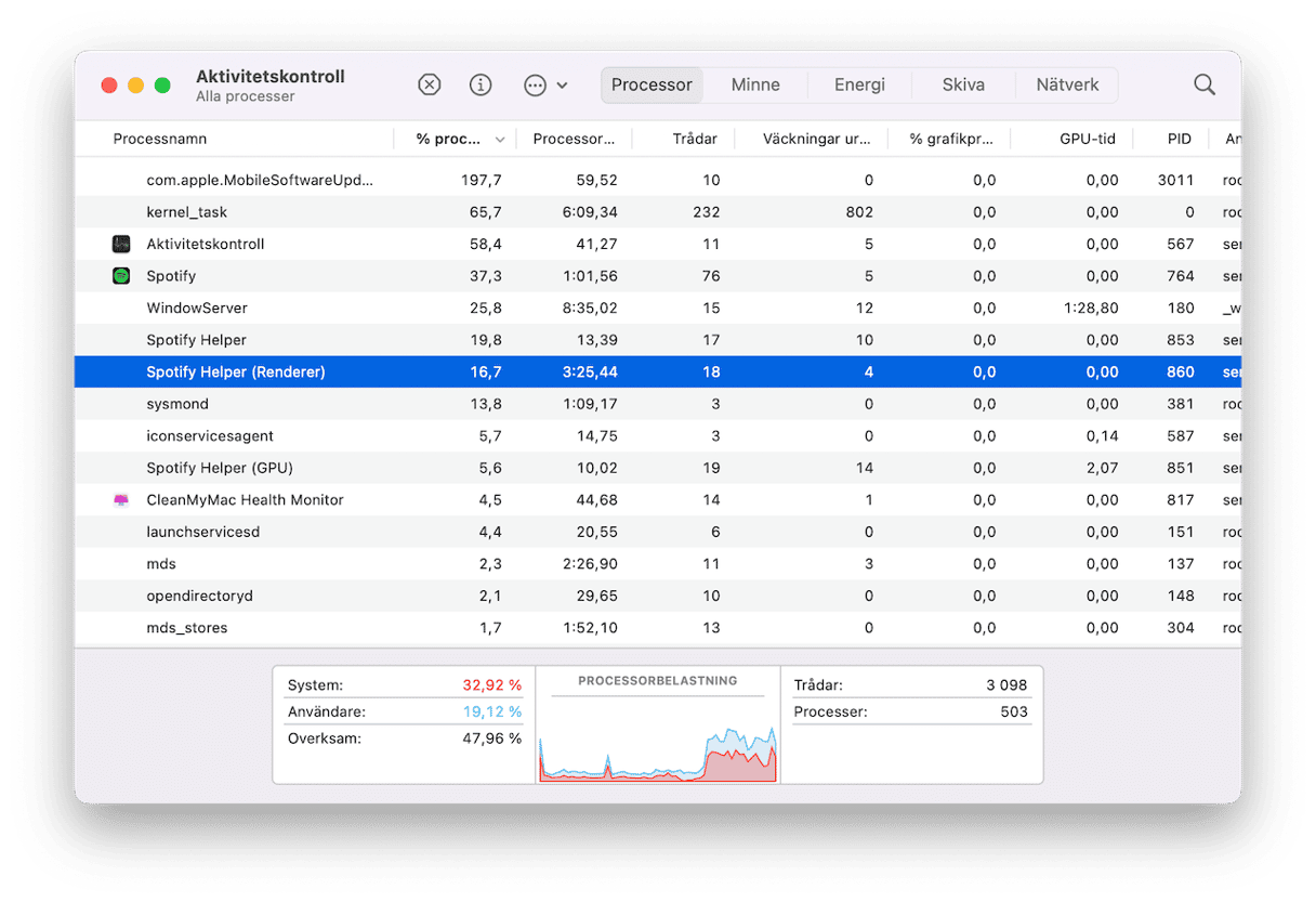 Ett av skälen till att badbollen dyker upp kan vara att datorn börjar bli gammal. Du kan se om så är fallet genom att titta på processorbelastningen. Kontrollera processorbelastningen med Aktivitetskontroll. Den finns i mappen Appar/Verktyg, eller sök med Spotlight.