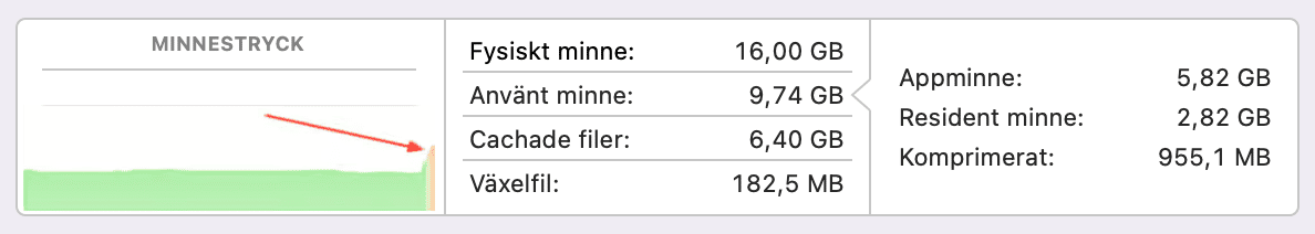 Ett annat möjligt problem med maskinvaran kan vara att det inte finns tillräckligt med RAM-minne. Ta reda på om du behöver mer RAM-minne genom att öppna Aktivitetskontroll igen. Den finns i mappen Appar/Verktyg. På fliken Minne kan du se en tabell och ett diagram över minnesbelastningen. Om diagrammet är rött och minnet hela tiden är fyllt av appar som är igång har du hittat problemet.