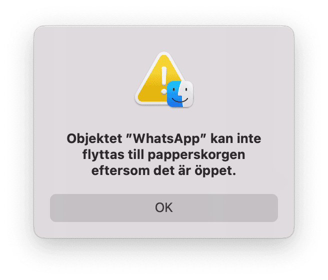 Om du försöker ta bort en låst eller skyddad app kan ett varningsmeddelande visas som förhindrar borttagningen. För att ta bort den låsta appen högerklickar (eller Kontroll-klickar) du på den i mappen Appar och väljer Visa info. I informationsfönstret letar du upp kryssrutan Låst och avmarkerar den. Därefter drar du appen till papperskorgen och tömmer den.