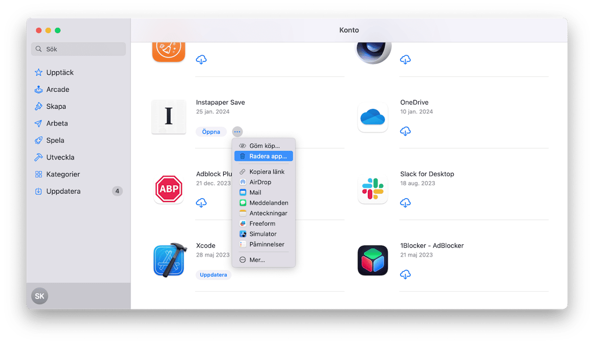 Obs! Om du redan har tagit bort några appar via Launchpad ser du knappen för ny nedladdning under appnamnet i App Store.
