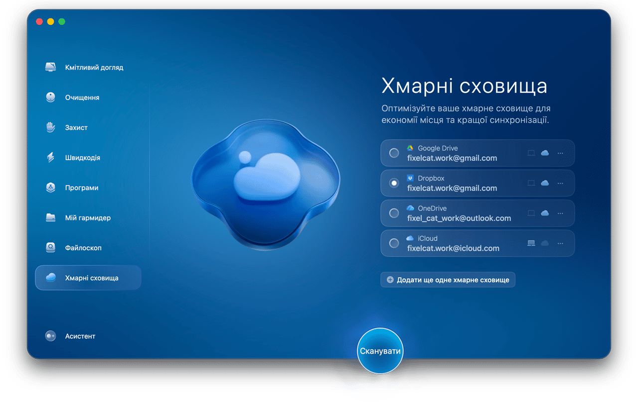 Наведіть лад не лише на вашому Mac, а й у хмарному сховищі. Знаходьте великі файли, що займають найбільше хмарного простору, та видаляйте зайві дублікати, які створюють безлад на вашому Mac.