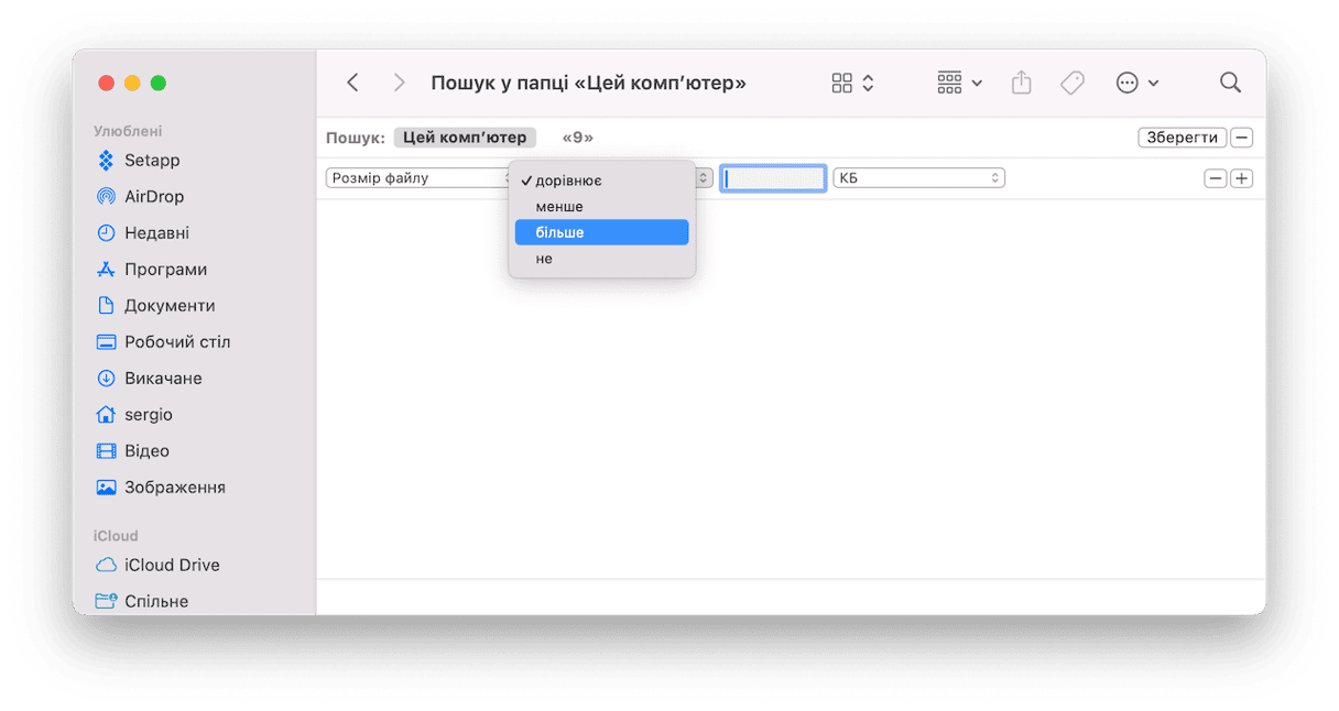 Не забудьте вибрати Цей комп'ютер, щоб отримати повний список результатів. Ви побачите всі файли, розмір яких перевищує заданий вами. Перегляньте знайдені документи та видаліть ті непотрібні, котрі займають забагато місця на вашому Mac.