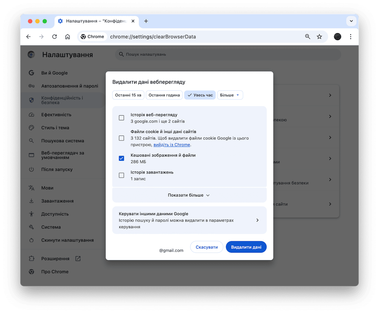 - Також виберіть пункт Кешовані зображення та файли та видаліть дані.