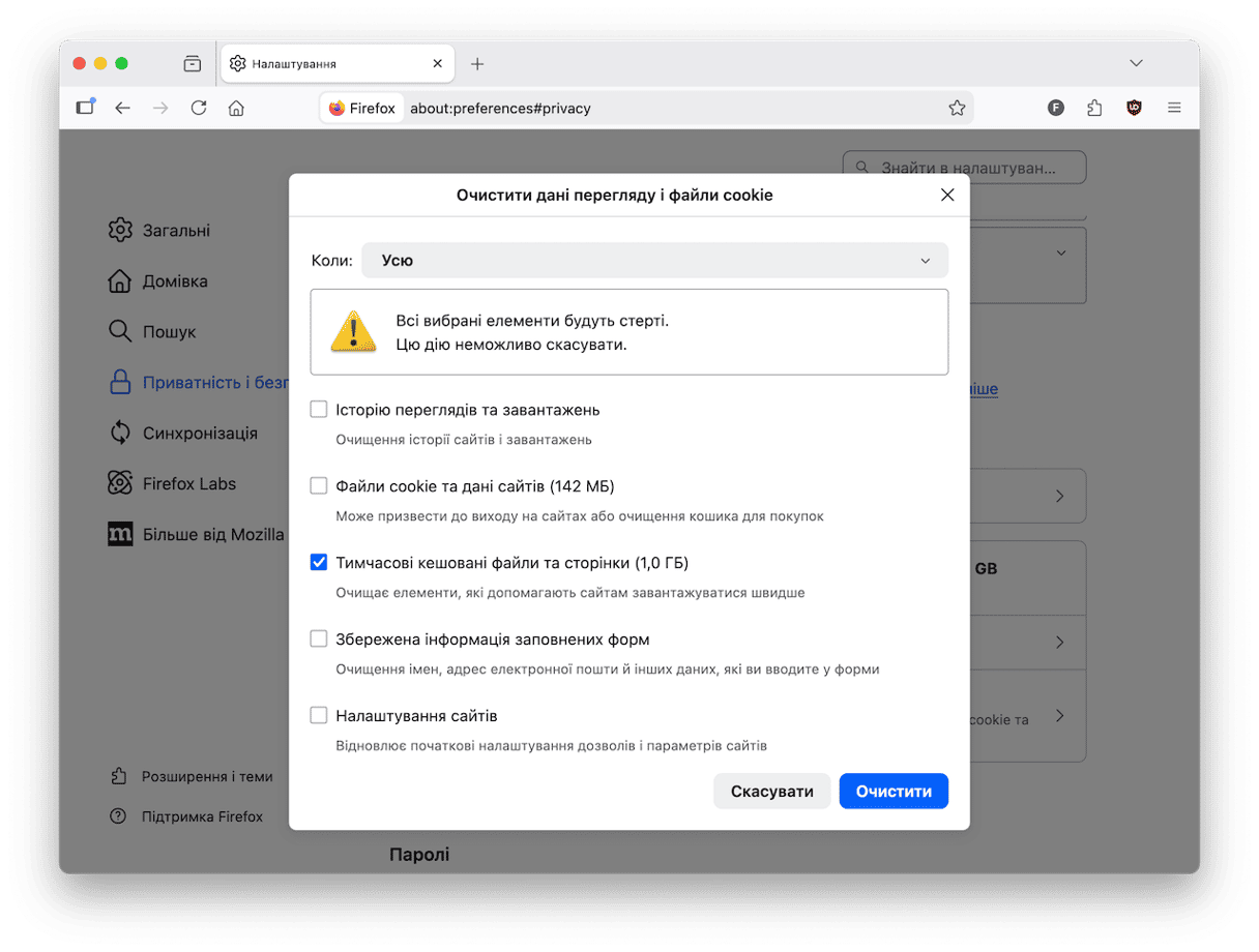 Або ж виберіть Очистити історію з кнопки меню (три горизонтальні смуги) і виберіть Тимчасові кешовані файли і сторінки зі списку.
