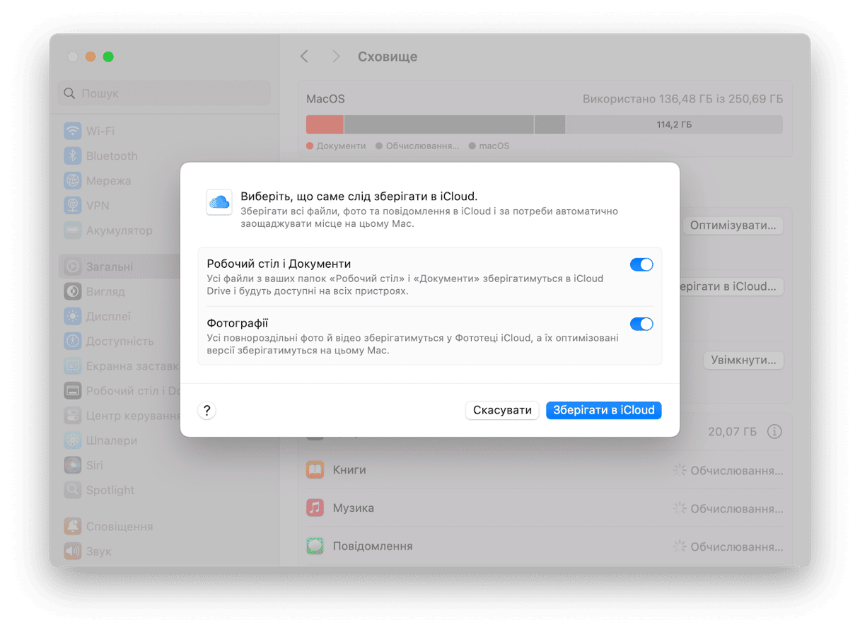 Але там також можуть бути інші папки, такі як Музика, Фотографії, Інші користувачі, Подкасти тощо. Щоб переглянути деталі свого сховища, перейдіть до меню Apple > Про цей комп'ютер > Докладніше > Параметри сховища.
