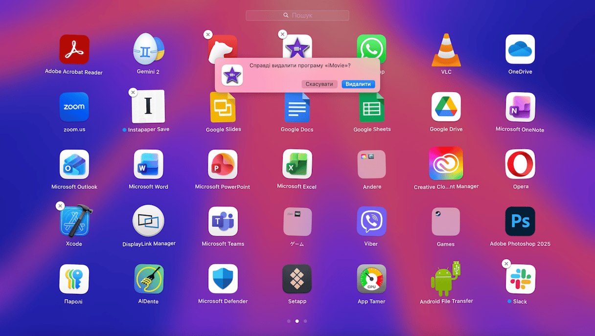 Мабуть це найвеселіший спосіб видалення програм. Відкрийте Lauchpad зі свого Dock. Тепер натисніть клавішу Command і утримуйте значок будь-якої програми, доки вона не почне тремтіти. Ви побачите символ [X] над піктограмою — натисніть його, щоб видалити програму.