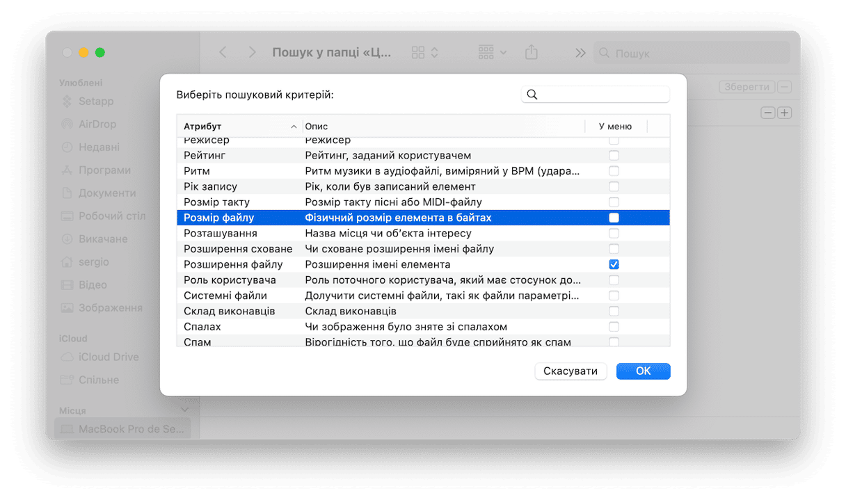 Чудова робота! Також ви можете вводити різні розширення файлів, натискаючи кнопку +, і сортувати результати за розміром (зауважте, що доведеться виконати наведені вище дії, але вибрати пункт Розширення файлу зі списку Інше…). Рекомендуємо розпочати з файлів .DMG або інсталяторів програм. Як правило, вони вже просто відпрацьований матеріал. Також варто переглянути й архіви ZIP.