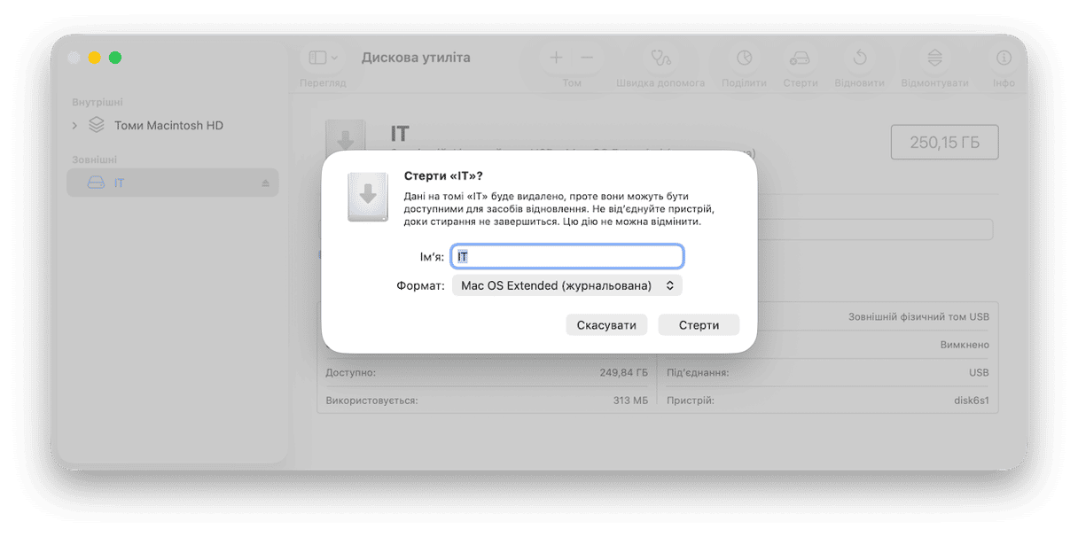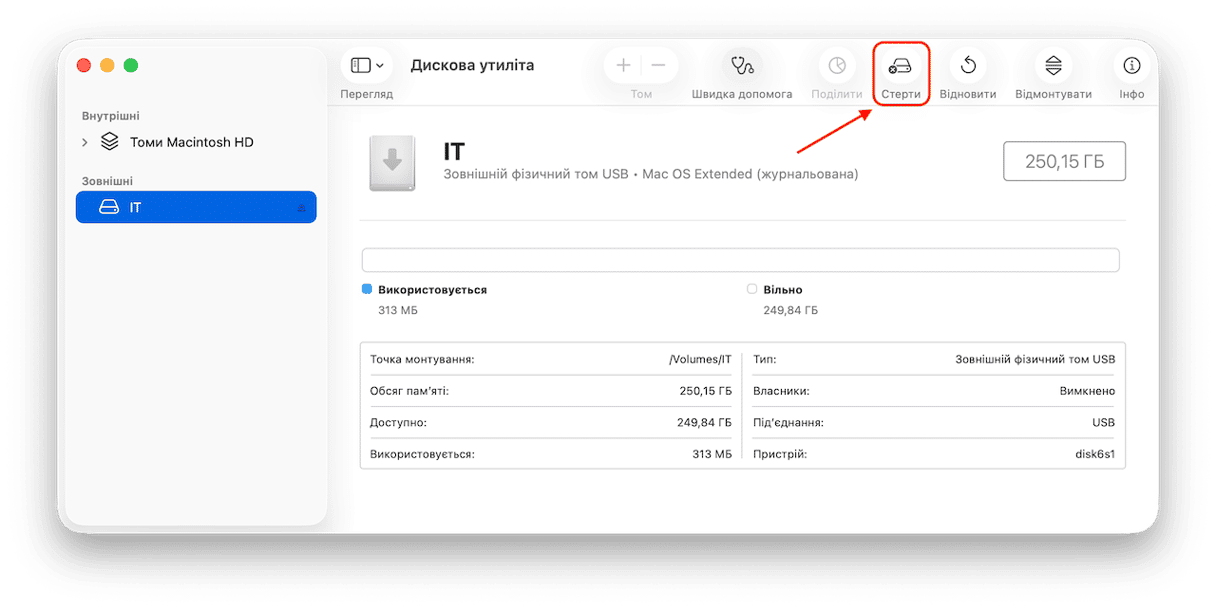 - Диск буде очищено та переформатовано, і після цього ваш Mac зможе записувати на нього файли.