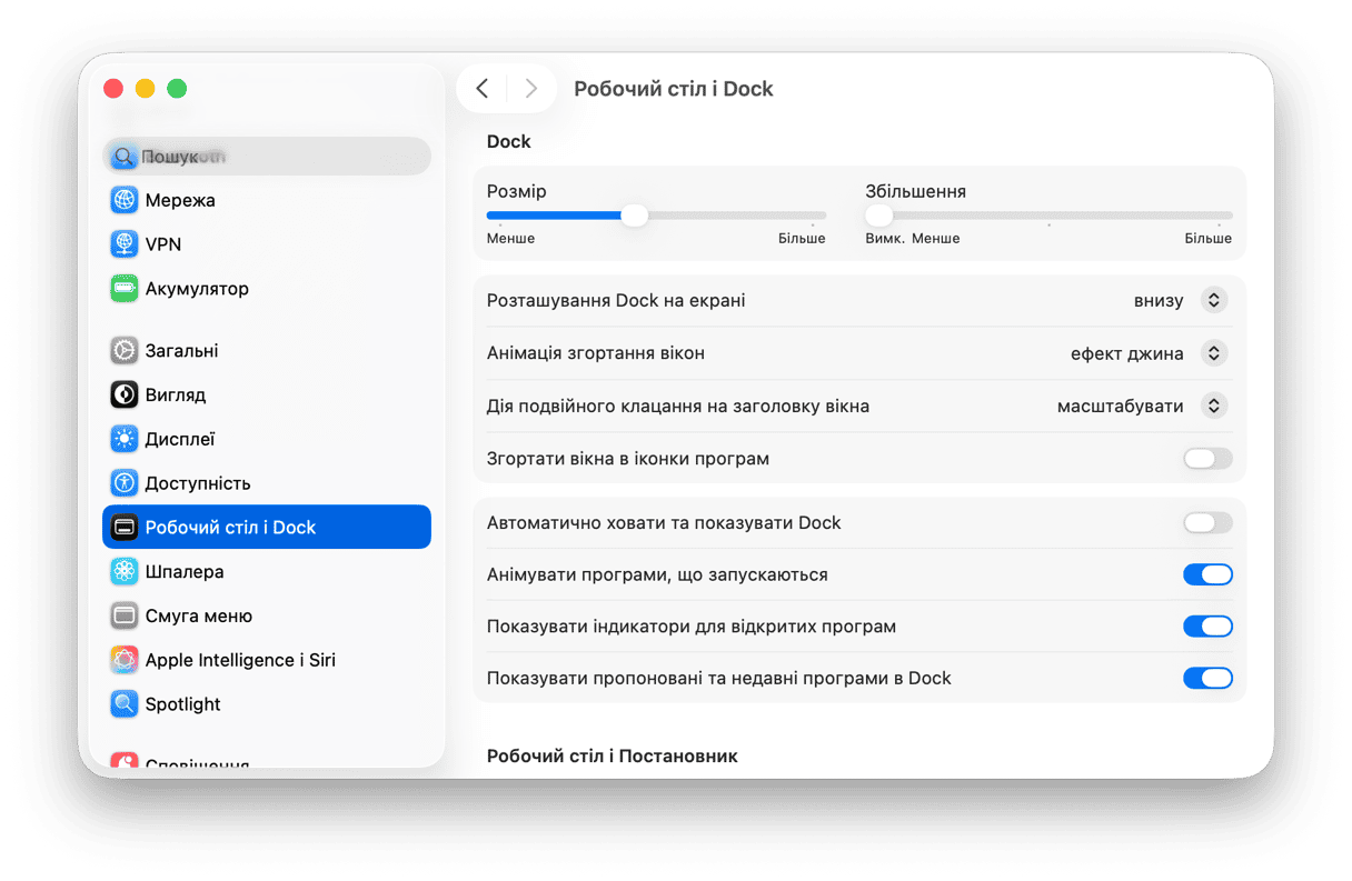 - Перейдіть до Системних параметрів > Робочий стіл і Dock.