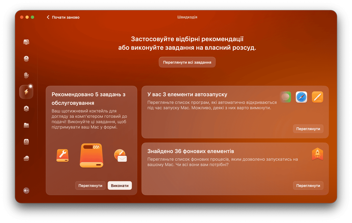 Після того, як за день завершилась індексація, я все ще відчував затримку при перемиканні між програмами. Тут я скористався функцією Швидкодії у CleanMyMac, на яку покладаюся вже багато років. Вона пропонує рекомендовані завдання з технічного обслуговування, які можуть дати дивовижний результат. Ось як це працює: