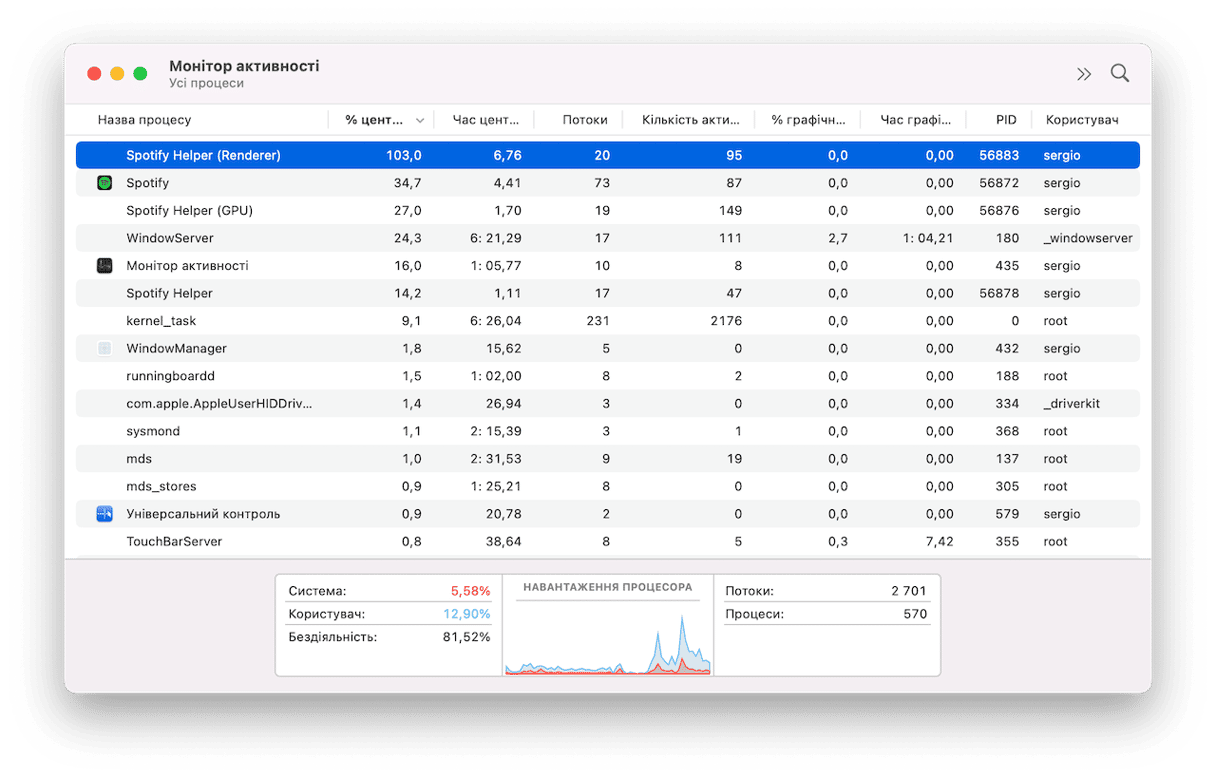 Однією з причин зависання та появи коліщатка-веселки може бути немалий вік вашого Mac. Це можна з'ясувати, переглядаючи рівень навантаження на процесор. Перейдіть до Монітора активності, щоб переглянути цей показник. Знайдіть його у папці Програми > Утиліти або знайдіть через Spotlight.