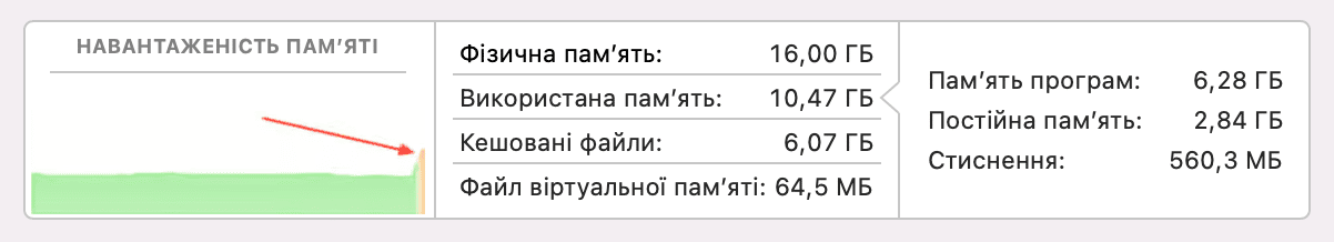 Можлива причина: нестача оперативної пам'яті. Ще одна можлива апаратна проблема – недостатній обсяг оперативної пам’яті. Щоб визначити, чи потрібно вам більше оперативної пам’яті, відкрийте Монітор активності. Він знаходиться в папці Програми > Утиліти. На вкладці Пам’ять ви побачите таблицю навантаженості пам’яті з графіком. Якщо графік червоний, а ваша пам’ять постійно навантажена через запущені програми – ви визначили проблему.